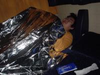 おもむろにエマージェンシーブランケットを広げる光君とそれをびっくりした表情で凝視する土屋先生。