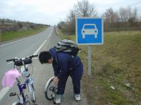 そしてしばらく走ると、幹線道路に出る。念には念を入れて自転車のタイヤに空気を足す光君。そして走りだそうとしたその時。車のマークの看板が目に入る