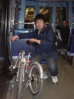 電車が来るまでの間に二人は自転車を折りたたむ。